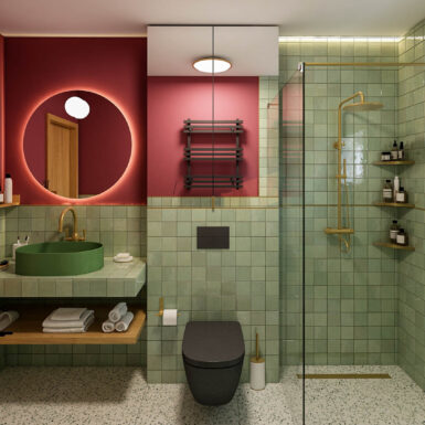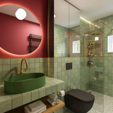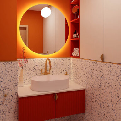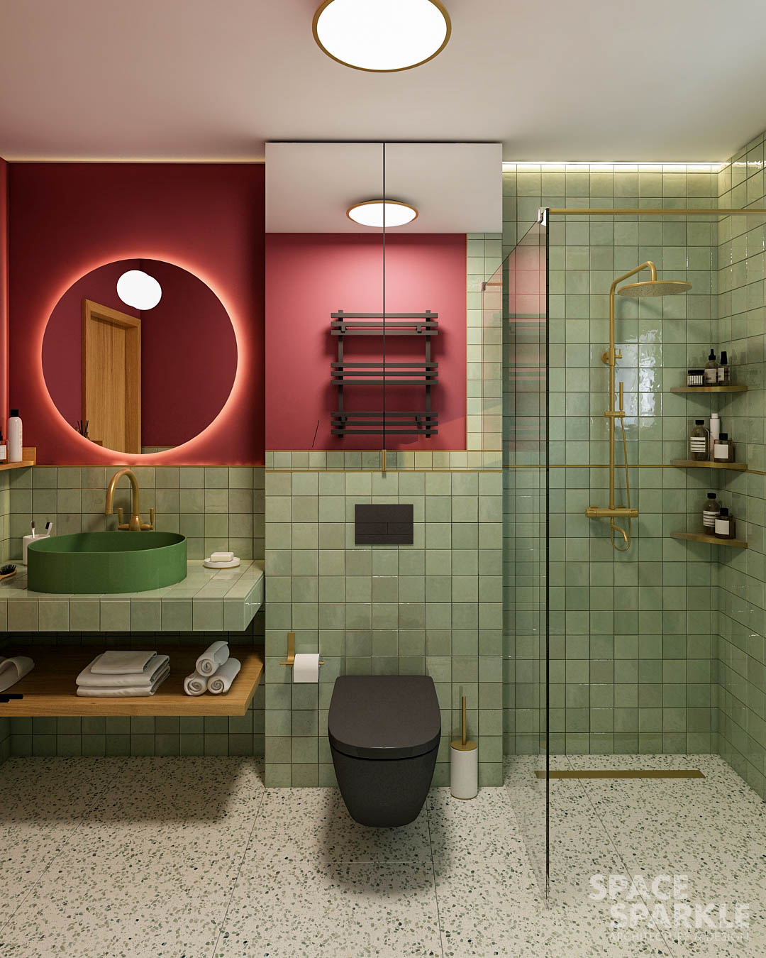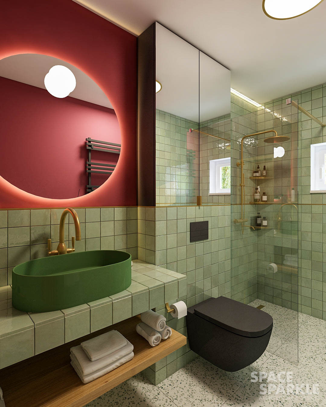 Baia explorează o combinație cromatică îndrăzneață, în care verdele plăcilor ceramice se întâlnește cu nuanțe calde de roșu-teracotă. Lavoarul cu formă sculpturală, accentele de alamă și iluminarea ambientală conturează un spațiu echilibrat, cu o notă ușor jucăușă. Texturile variate – de la ceramică la terrazzo – contribuie la o experiență vizuală bogată.