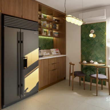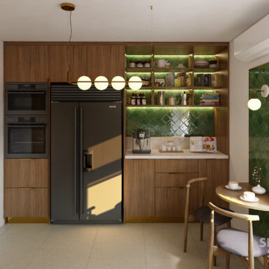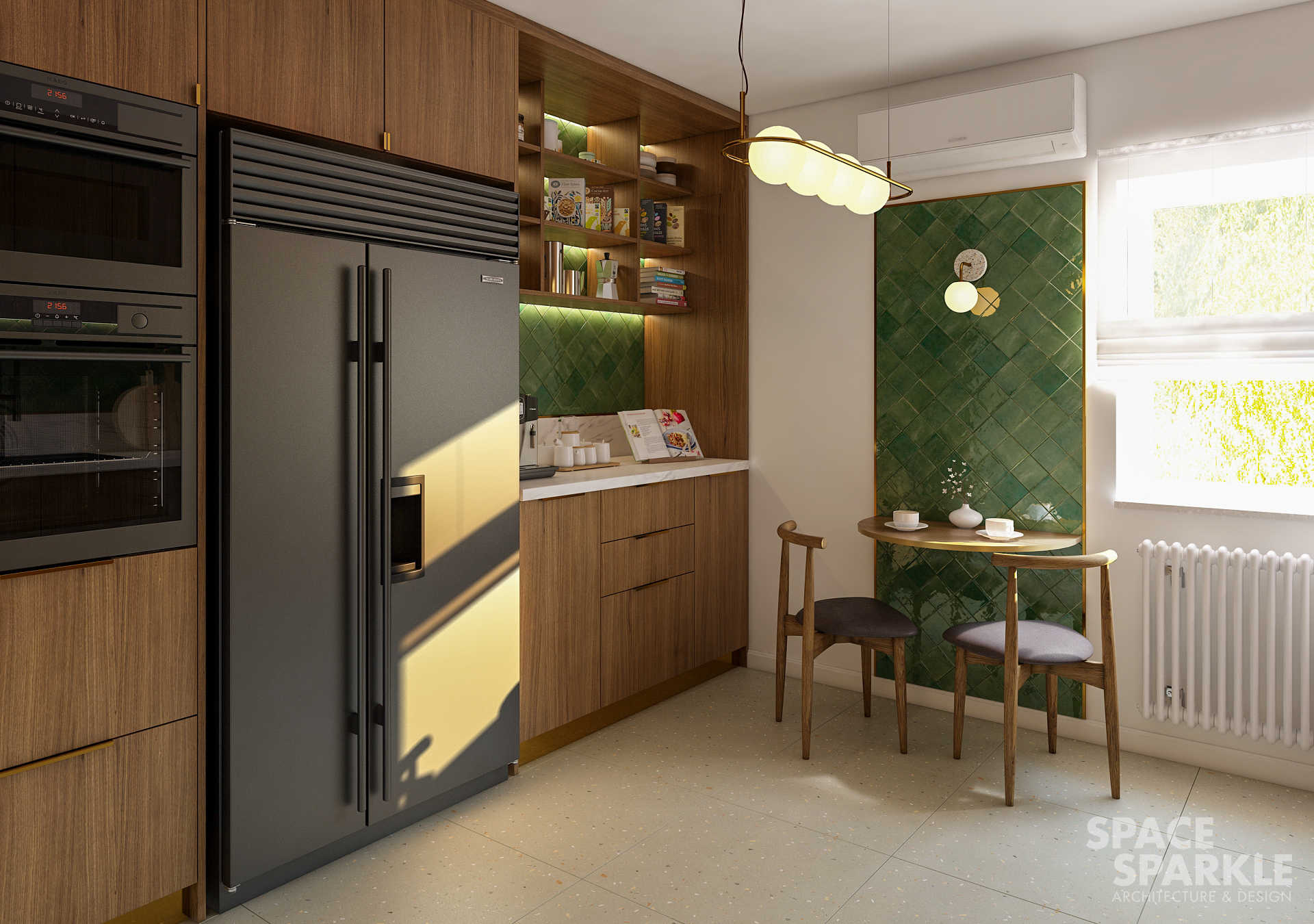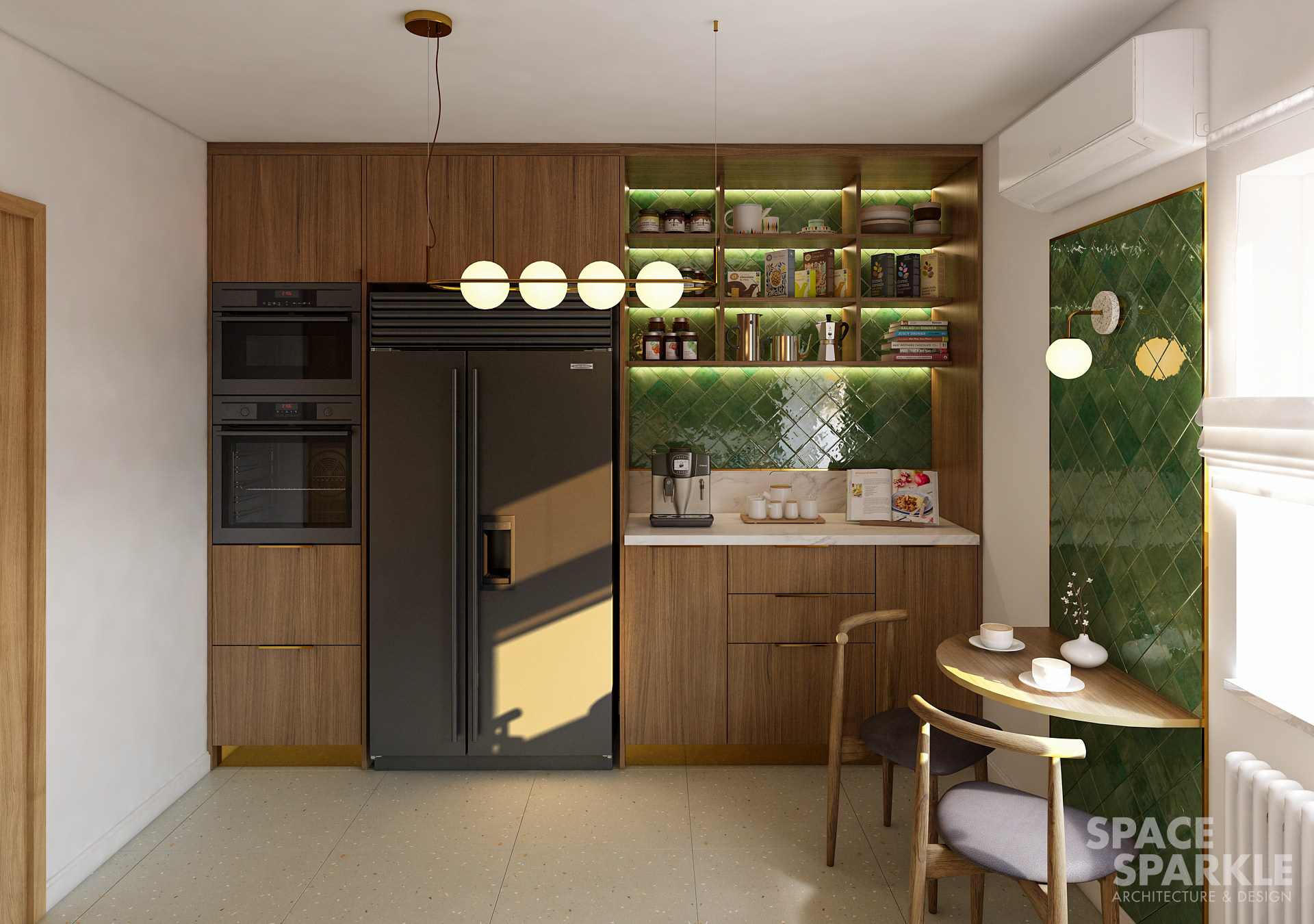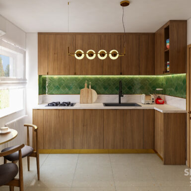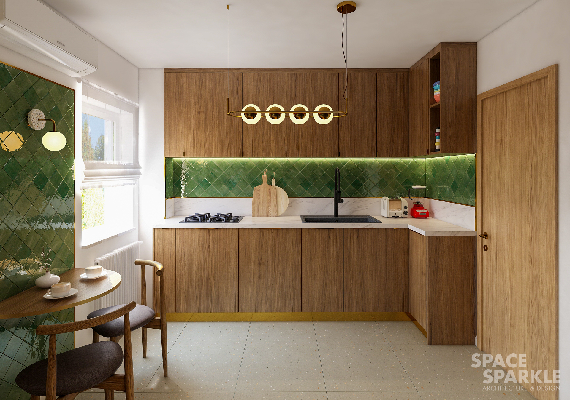 In crearea unui concept unitar lemnul natural a jucat un rol esențial, aducând echilibru și continuitate vizuală. Bucătăria a fost finisata integral cu furnir de nuc, completat de un backsplash în nuanțe intense de verde smarald, dispus într-un pattern dinamic. Blatul deschis și iluminarea caldă sub corpurile suspendate creează contrast și funcționalitate, iar accentele de alamă din corpurile de iluminat adaugă eleganță subtilă.