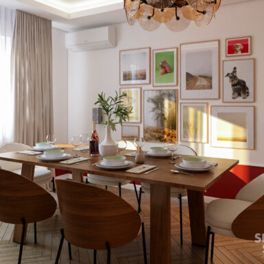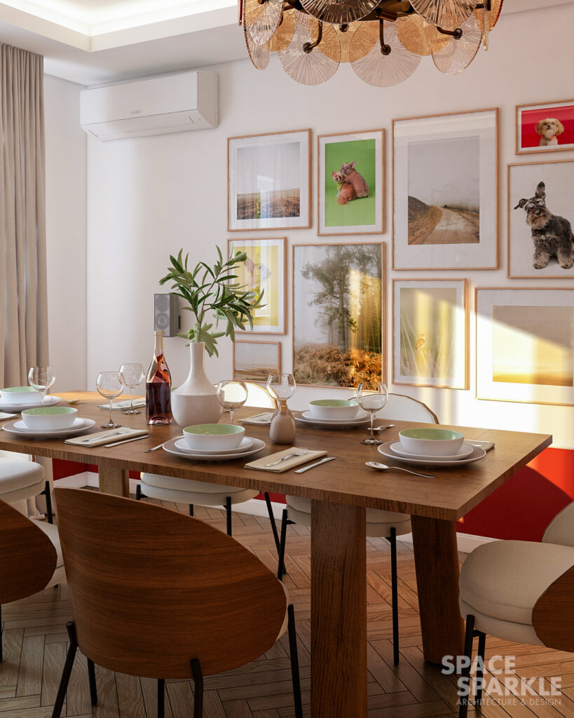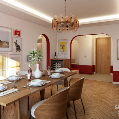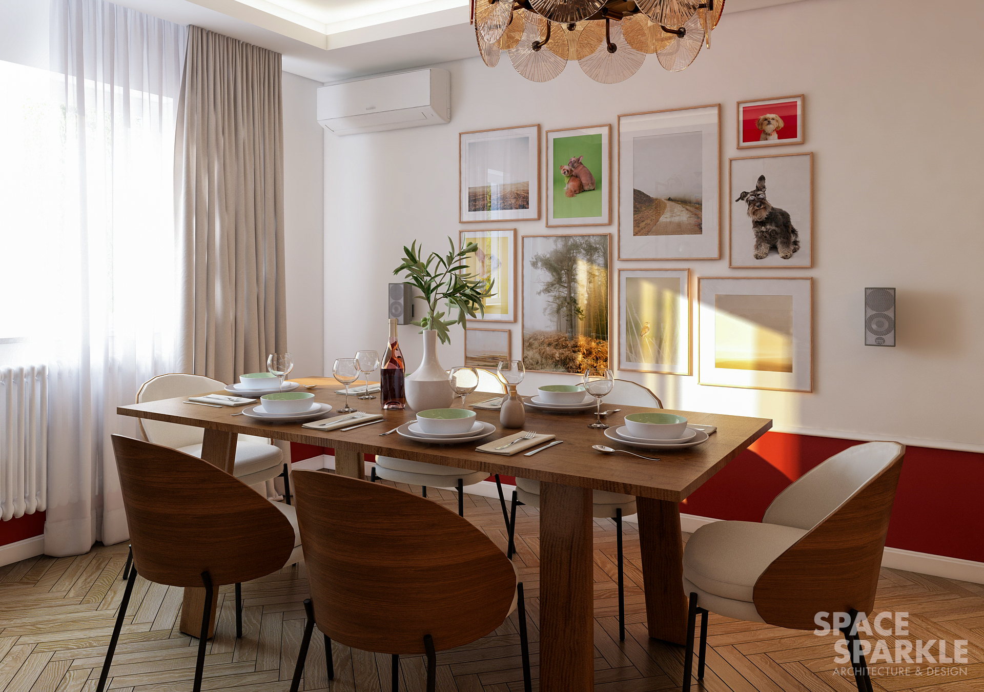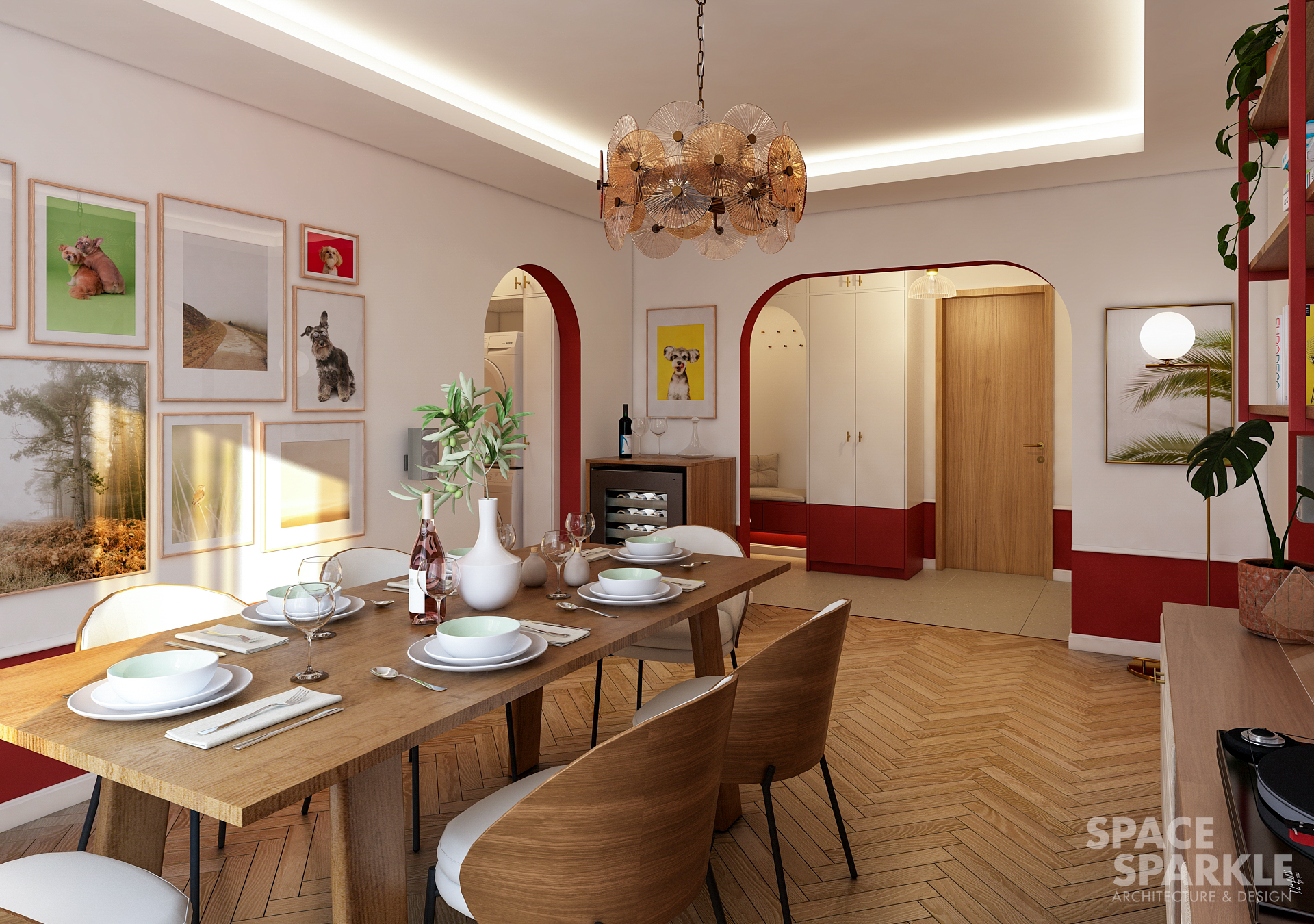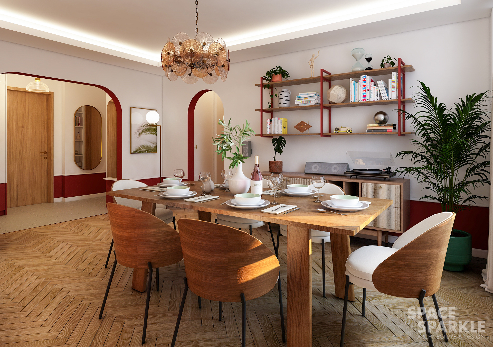 Zona de dining continuă povestea printr-o combinație de tonuri calde de lemn, textile neutre și accente roșii arhitecturale care marchează trecerile dintre spații. Corpurile de iluminat statement și mobilierul cu linii retro completează atmosfera specifică stilului mid-century modern, păstrând în același timp confortul contemporan.