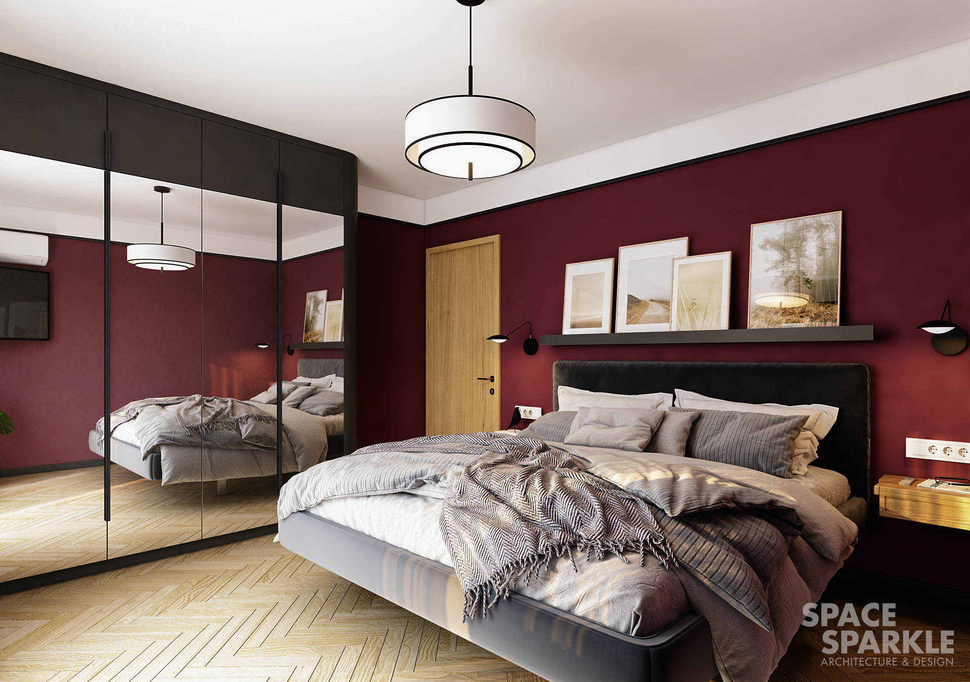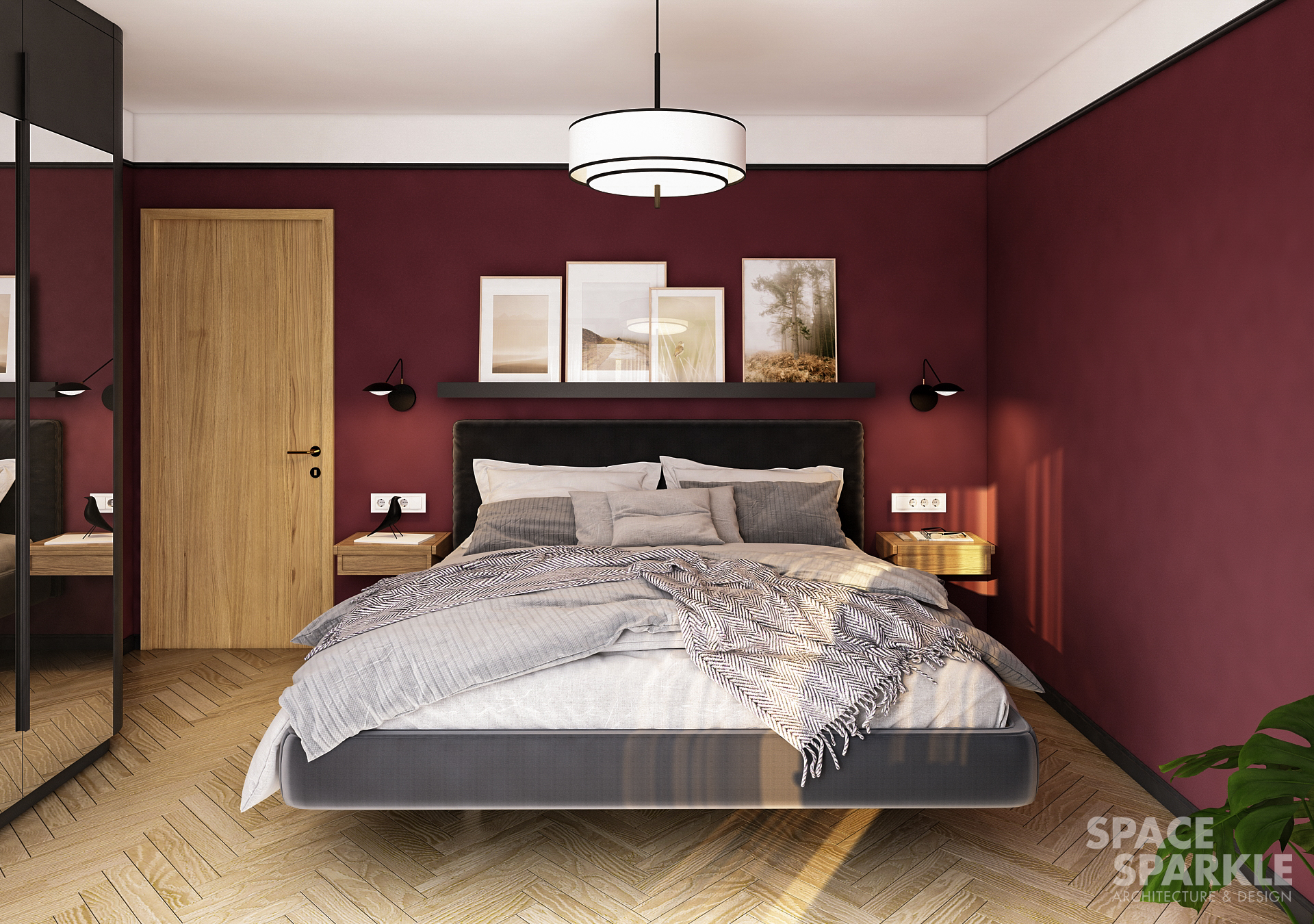 Paleta cromatică a întregului apartament este dominată de verde, roșu cărămiziu și tonuri naturale de lemn, echilibrate de suprafețe deschise și detalii metalice din alamă. Aceste accente metalice sunt integrate atent în fiecare încăpere, de la baterii și corpuri de iluminat până la detalii decorative, oferind un aspect elegant întregului proiect.